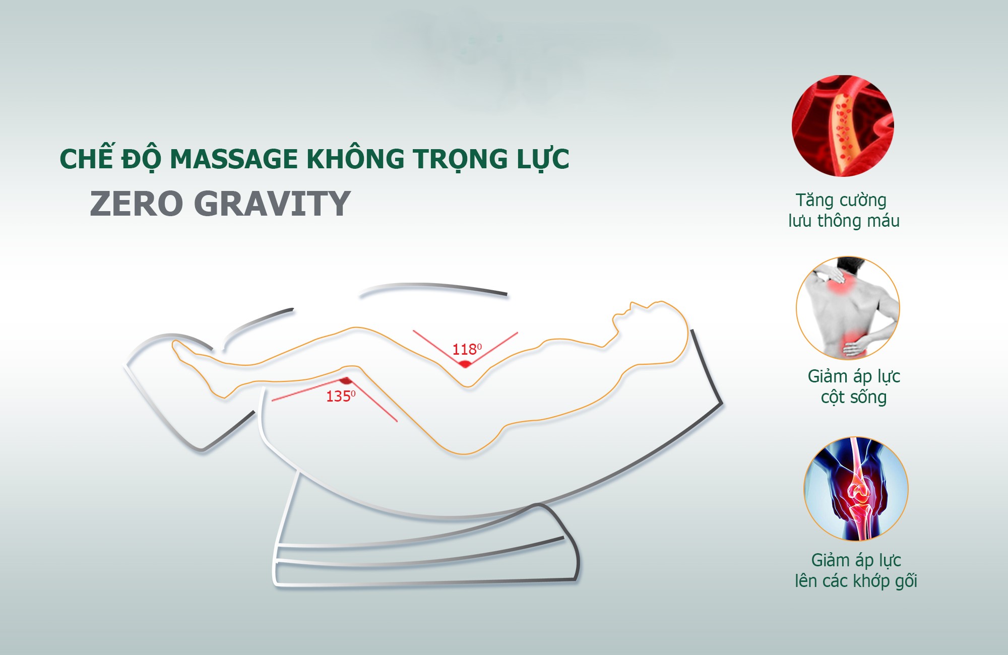 Một trong những điểm đặc biệt của Zero Gravity là thiết kế đưa phần chân cao hơn tim. Điều này mang lại hiệu ứng tích cực cho toàn bộ hệ thống tuần hoàn:
