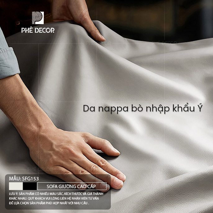 - Vỏ bọc Da Nappa bò nhập khẩu từ Ý: Bề mặt sofa được bao bọc bởi lớp da Nappa – được mệnh danh là “vua” của các loại da. Chất liệu này không chỉ sở hữu bề mặt siêu mềm mịn, thoáng khí, mà còn có độ bền và vẻ đẹp tự nhiên mà không loại da công nghiệp nào có thể sánh được.