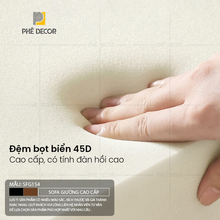 - Đệm bọt biển 45D cao cấp: Phần đệm sử dụng đệm bọt biển 45D – một loại mút có tỷ trọng cực cao, mang lại khả năng nâng đỡ cơ thể hoàn hảo và chống xẹp lún vượt trội. Cảm giác khi ngồi hay nằm trên SFG154 luôn êm ái nhưng vẫn đủ vững chãi để bảo vệ cột sống.
