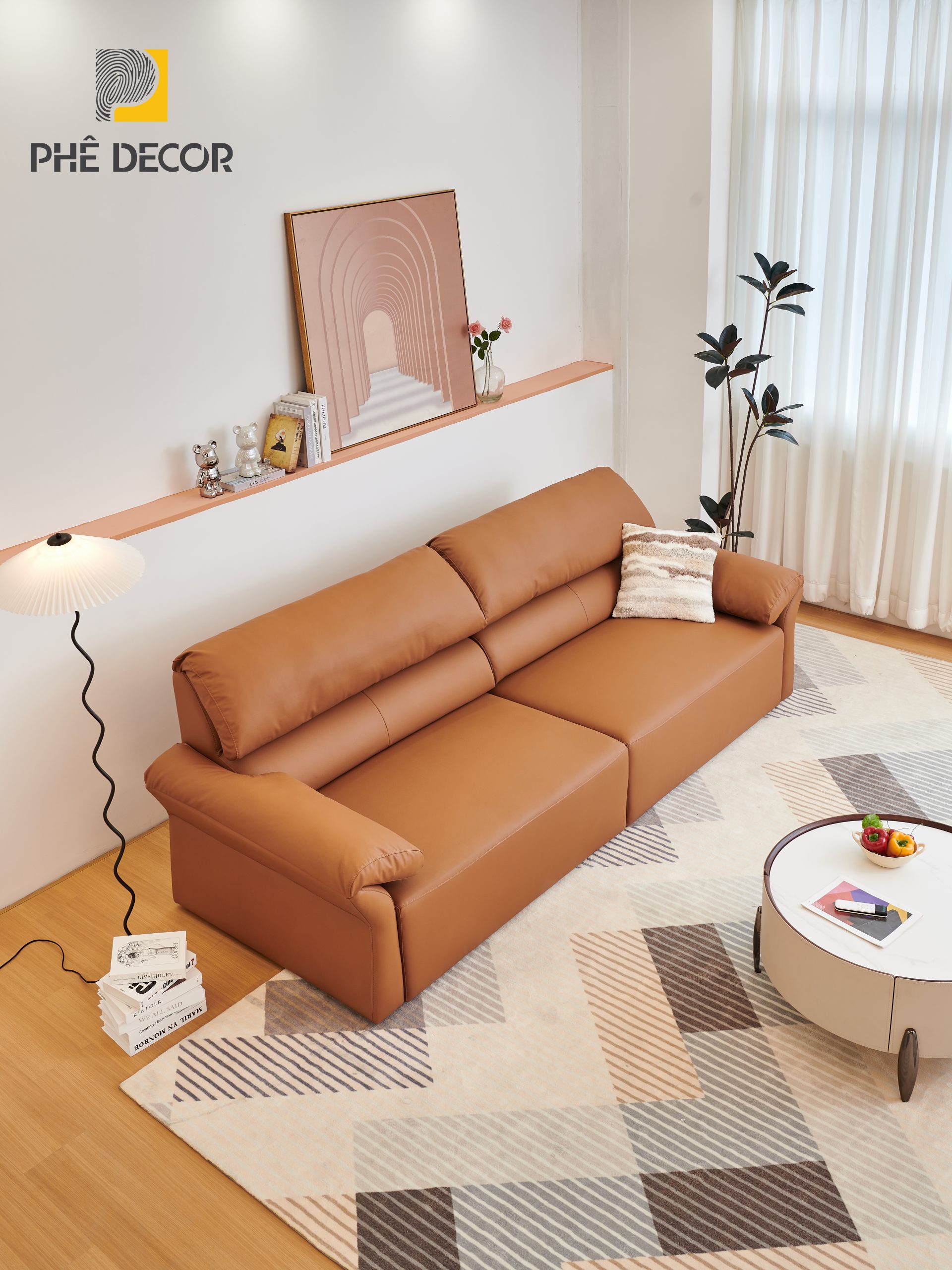 - Vỏ bọc da nhân tạo sinh thái cao cấp: Bề mặt sofa được bao bọc bởi một loại vật liệu thế hệ mới, có bề mặt mềm mịn, thoáng khí và vẻ ngoài sang trọng như da thật, nhưng lại thân thiện với môi trường và dễ dàng bảo quản hơn.